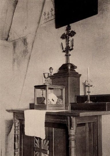 His head was preserved and up to recently kept as a sacred relic in the attic chapel at Lane End House, Mawdesley, Chorley, Lancashire, a 16th century house on the edge of the village, otherwise known as “The Skull House”. This picture of the skull in a glass case is from 1906.